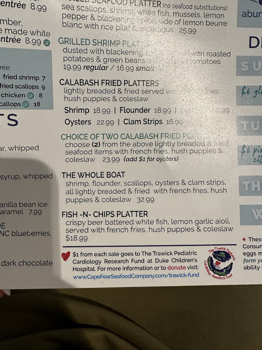Choose two options of lightly breaded & fried Shrimp | Flounder | Scallops | Oysters | Clam Strips, served with 4 hush puppies and your choice of two sides